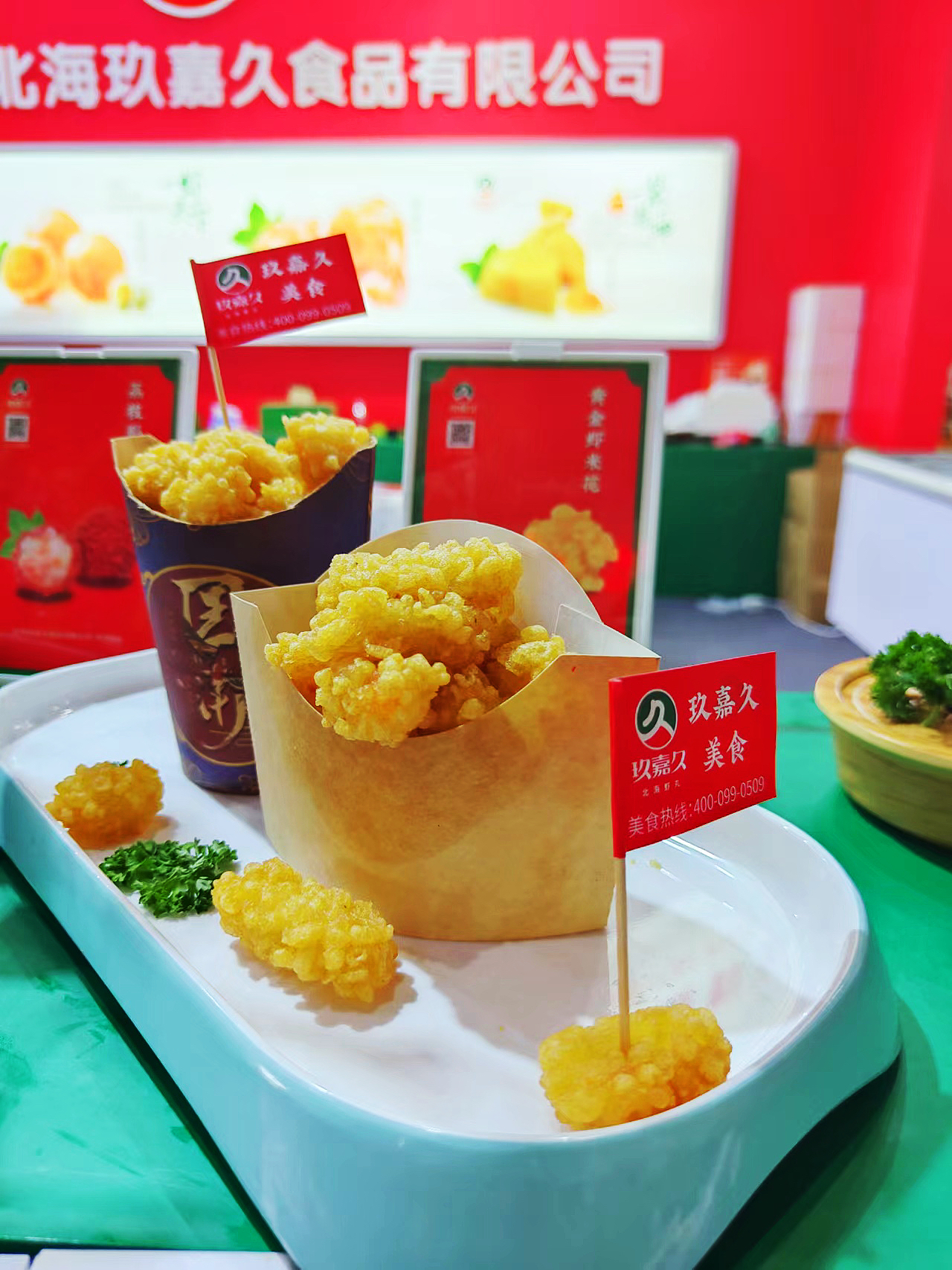 在展會現(xiàn)場有不少客戶是為我們的炸物系列新品而來的,點(diǎn)名要試吃我們的新品。有色澤誘人的黃金蝦米花,遠(yuǎn)遠(yuǎn)便能聞到一陣酥香;荔枝形蝦球,似荔枝不是荔枝,形狀逼真,引發(fā)消費(fèi)者的獵奇心理;黑虎蝦蝦卷,腐皮薄如蟬翼,內(nèi)餡蝦仁爽脆,搭配甜辣醬口感一絕,想必有這些產(chǎn)品的加持一定能引爆門店下半年的客流量。