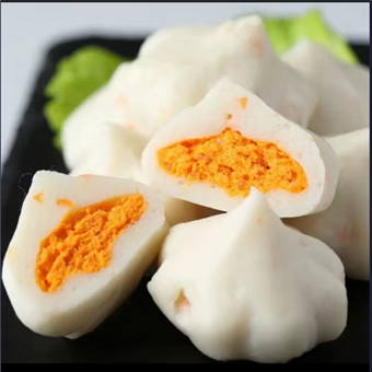產(chǎn)品特性:鱈魚漿外皮,蟹黃及新鮮魚卵內(nèi)陷,咬開湯汁四溢!
